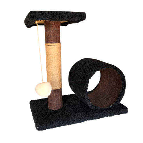 Este rascador multifunción es ideal para gatos curiosos y juguetones. Cuenta con un poste revestido en yute natural para el cuidado de las uñas, una plataforma elevada para vigilar desde lo alto, y un túnel cubierto perfecto para esconderse o descansar. Además, incluye una pelota colgante que estimula el juego y la actividad física.